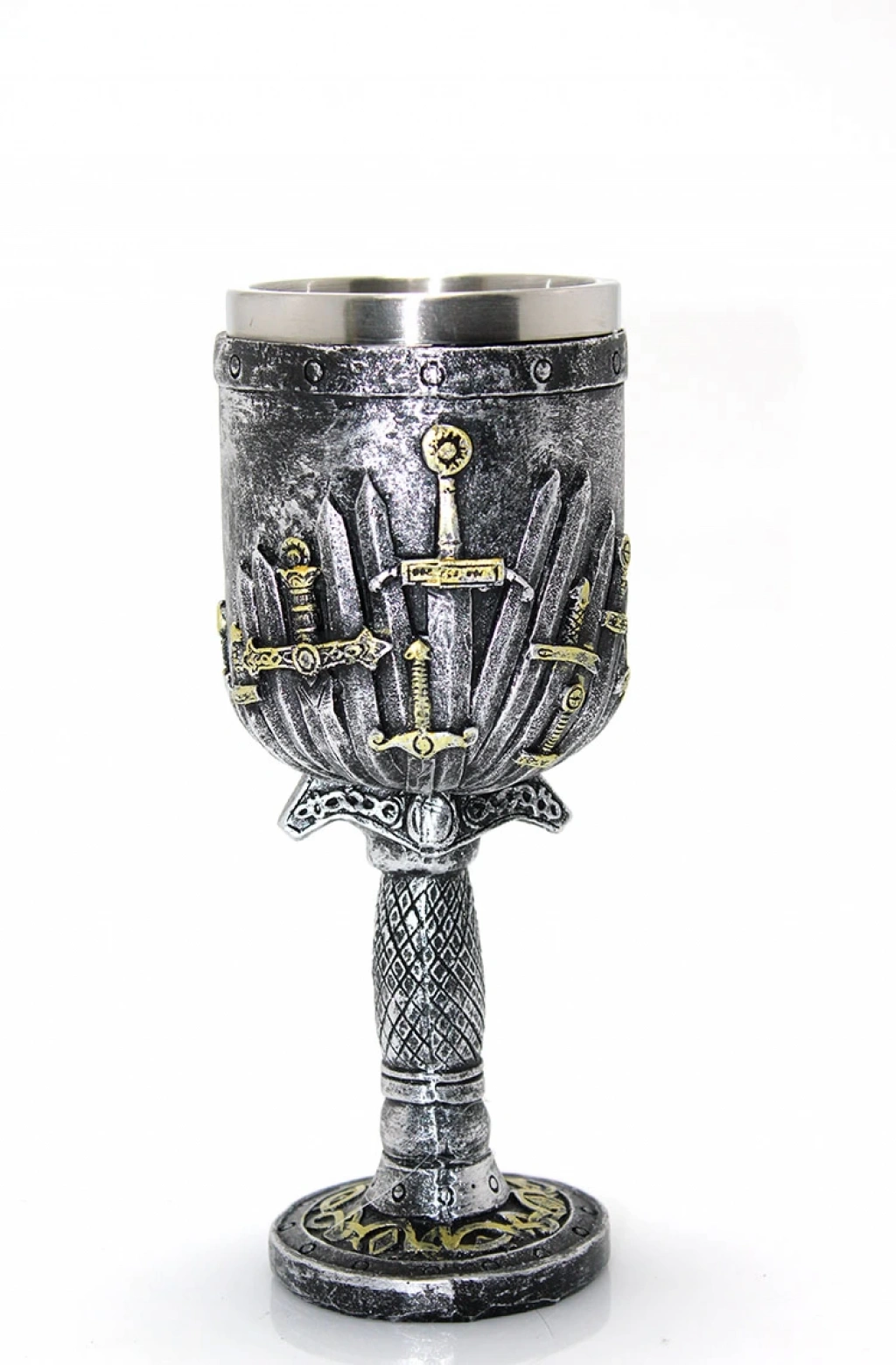 PASLANMAZ ÇELİK KADEH BARDAK MODEL 1Ürün ÖzellikleriPaslanmaz Çelik Kadeh Bardak Model 1, kılıç temalı detaylarıyla benzersiz bir içecek aksesuarıdır. Dayanıklı paslanmaz çelik yapısı, sıcak ve soğuk içeceklerinizi uzun süre muhafaza eder. Kılıç tasarımlı dış yüzeyi, kupaya tarihi ve estetik bir hava katar, koleksiyon severler için ideal bir parça haline getirir. Hem dekoratif bir masaüstü objesi hem de işlevsel bir içecek kabı olarak kullanılabilir. Tarih ve fantastik temalara ilgi duyanlar için harika bir seçimdir.Paket İçeriği1 adet Paslanmaz Çelik Kadeh Bardak Model 1